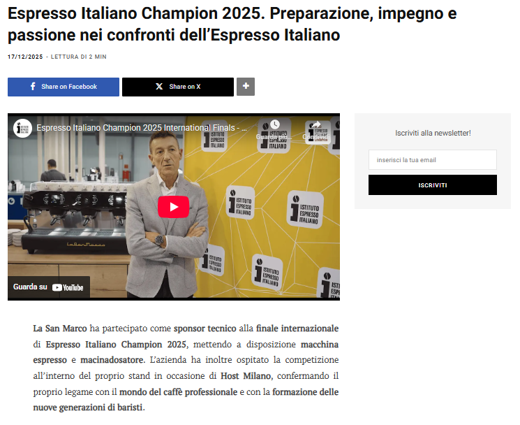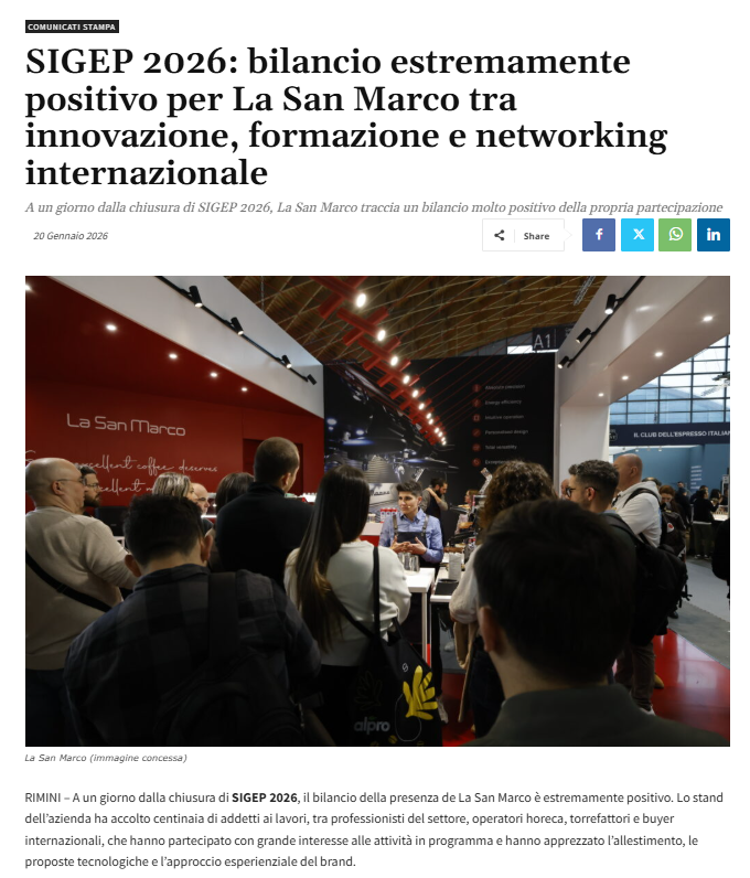 Dal 1920, La San Marco rappresenta l’eccellenza nella produzione di macchine per caffè espresso. È leader riconosciuto nel segmento delle macchine con il tradizionale sistema a leva. Produce inoltre un’ampia gamma di macchine tradizionali, automatiche e semiautomatiche, macchine a capsule, macinini e altre attrezzature professionali per bar, ristoranti e hotel, che distribuisce in tutto il mondo.